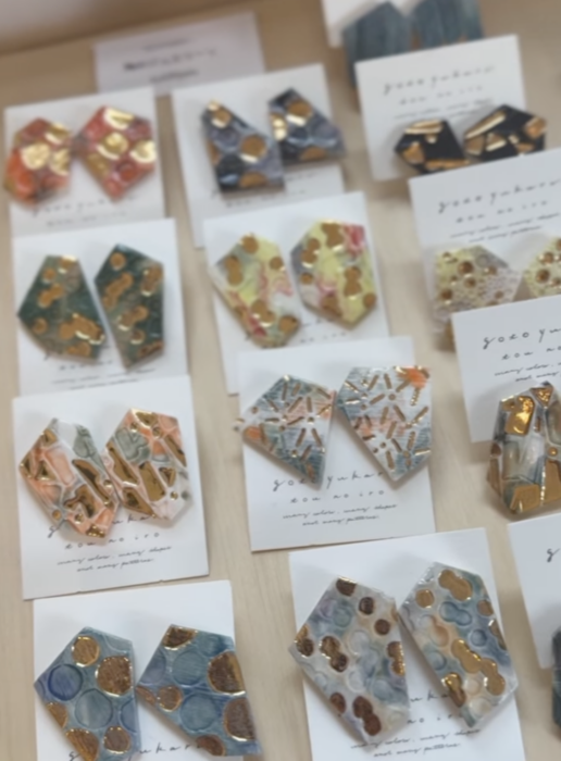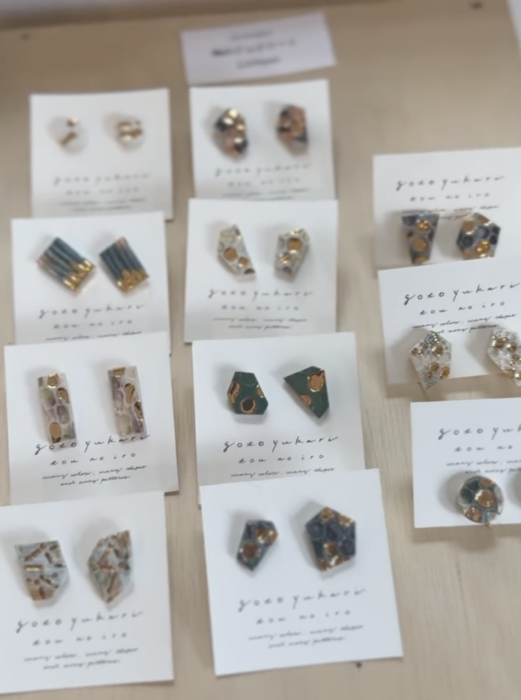 ピアスとイヤリングがあります。ひとつひとつ、華やかに彩られた陶器のカケラは選ぶのもたのしい。ぜひ見に来てくださいね。